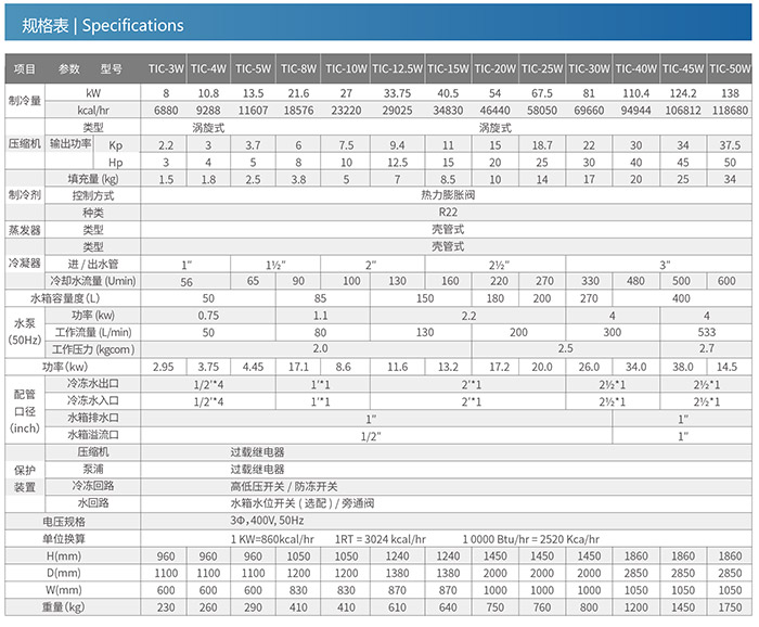 1)Refrigeration capacity is tested under the condition that cold water outlet temperature is at 12° and ambient temperature is at 30°.
