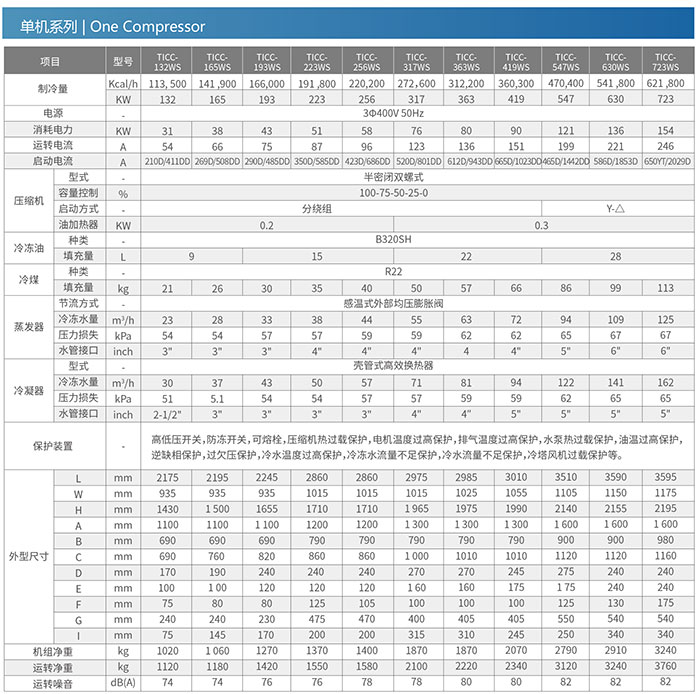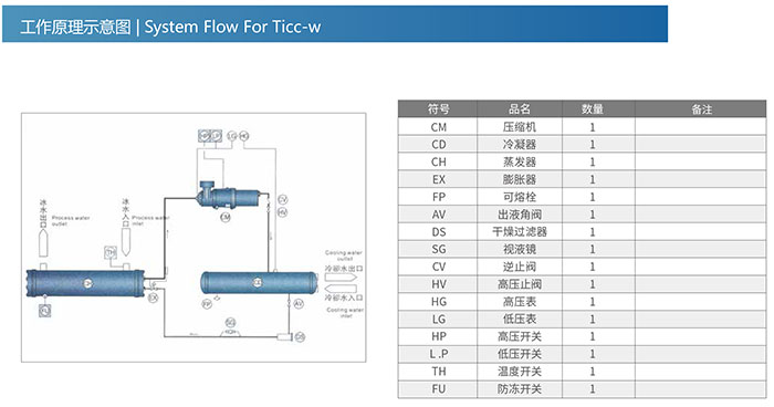 Note: 1)The refrigerant capacity is tested under conditions that process water inlet temp.is at 12C,process water outlet temp.is ai 7C,cooling water inlet temp.is at