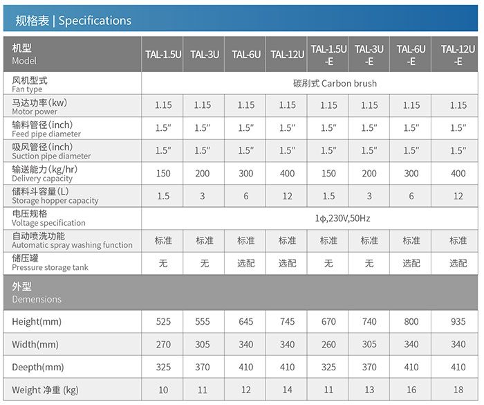 TAL-1.5U~TAL-12U 采用碳刷马达,转速高、风量大,体积小,整机移动方便,且易于安装;
