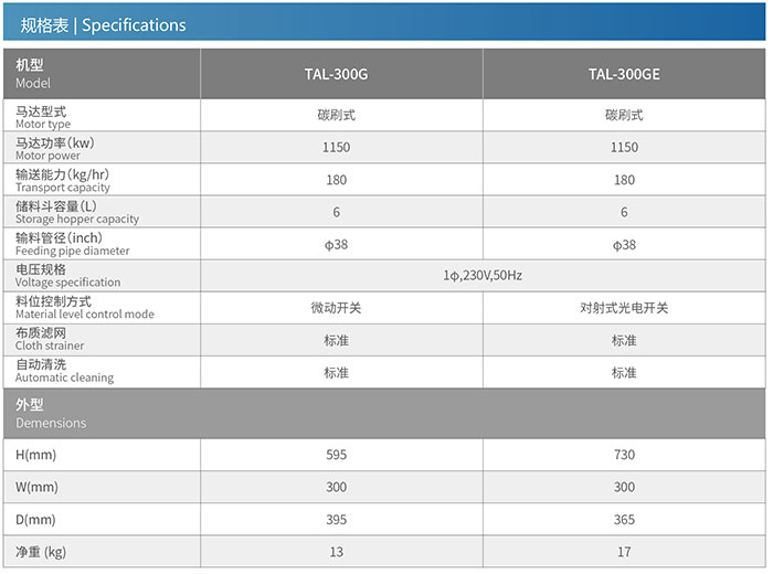 TAL-300 系列采用 碳刷马达,体积小,重量轻,吸力强,安装方便,适合新料输送。