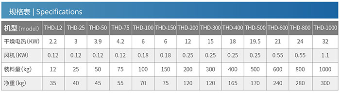 THD-800 and THD-1000 have down-blowing air pipe and accessible door for easy material clearance)of the hopper with capacity ranging from 12kg to 1000kg. all models can be supplied with optional 24 hours auto start/stop timer.