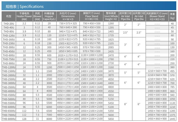 合搭配除湿机用来乾燥工程塑料,该系列能提供的装料容量由 20U~8000U,共分为 25 种机型。