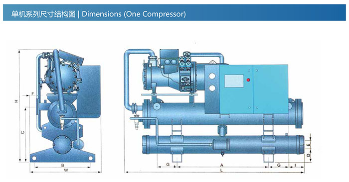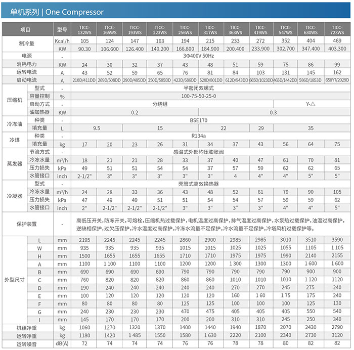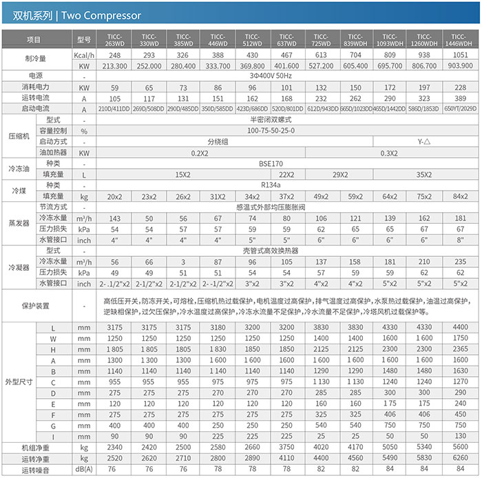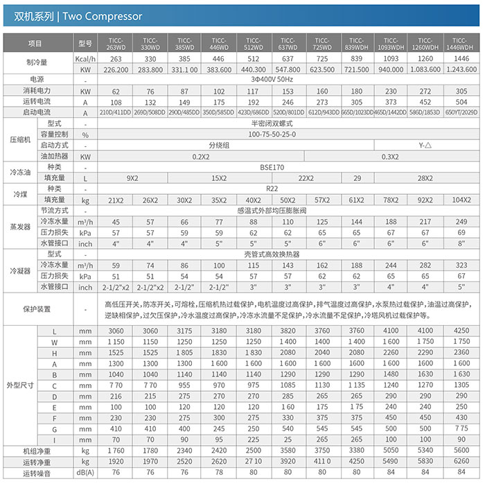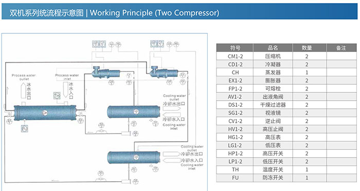 Note: 1)The refrigerant capacity is tested under conditions that process water inlet temp.is at 12C,process water outlet temp.is ai 7C,cooling water inlet temp.is at