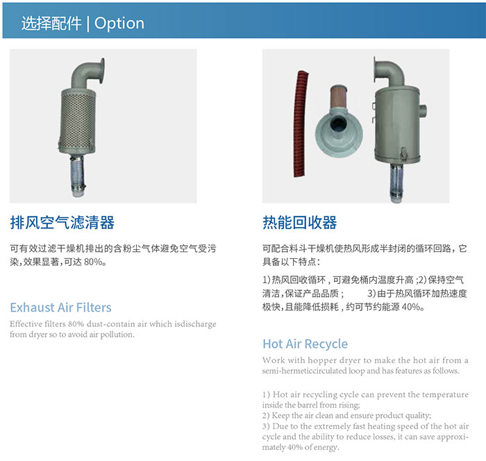 有排风旋风器、排风空气滤清器、热风回收器、铝制磁力底座、风车入口过滤器、料斗磁铁、欧化吸料盒、