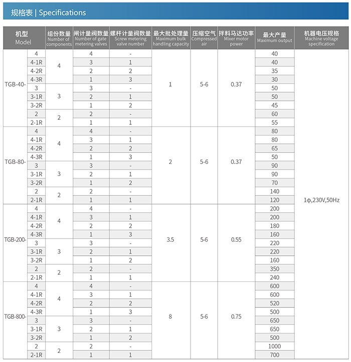 TGB 系列称重式拌料机采用新一代的单晶片微处理器、功能更强大、运算速度更快、抗干扰能力更强的单晶片微处理器 , 具有自动补偿功能 , 在每次开机时能自动校准以确保精度准确。该系列新产品主要应用于塑料射出、压出或中空成型制程上需要多种原料按重量比例做精确混合的使用场合。