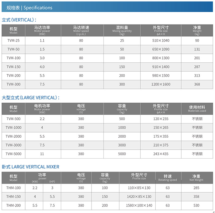 TVM 系列立式混合机为粉末、颗粒状物料混合机 , 具有结构简单 , 容易操作 , 维护清洗方便 , 速度快 , 混合效果佳等特点。